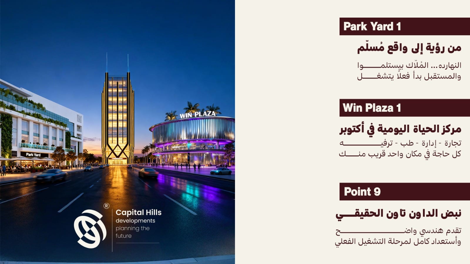وفي العاصمة الإدارية الجديدة، تواصل كابيتال هيلز أعمالها في مشروع Point 9 الواقع بمنطقة الداون تاون، حيث تم الانتهاء من الأعمال الخرسانية والتقسيمات الداخلية ، ويجري حاليًا تنفيذ البنود التخصصية تمهيدًا لبدء التشطيبات.