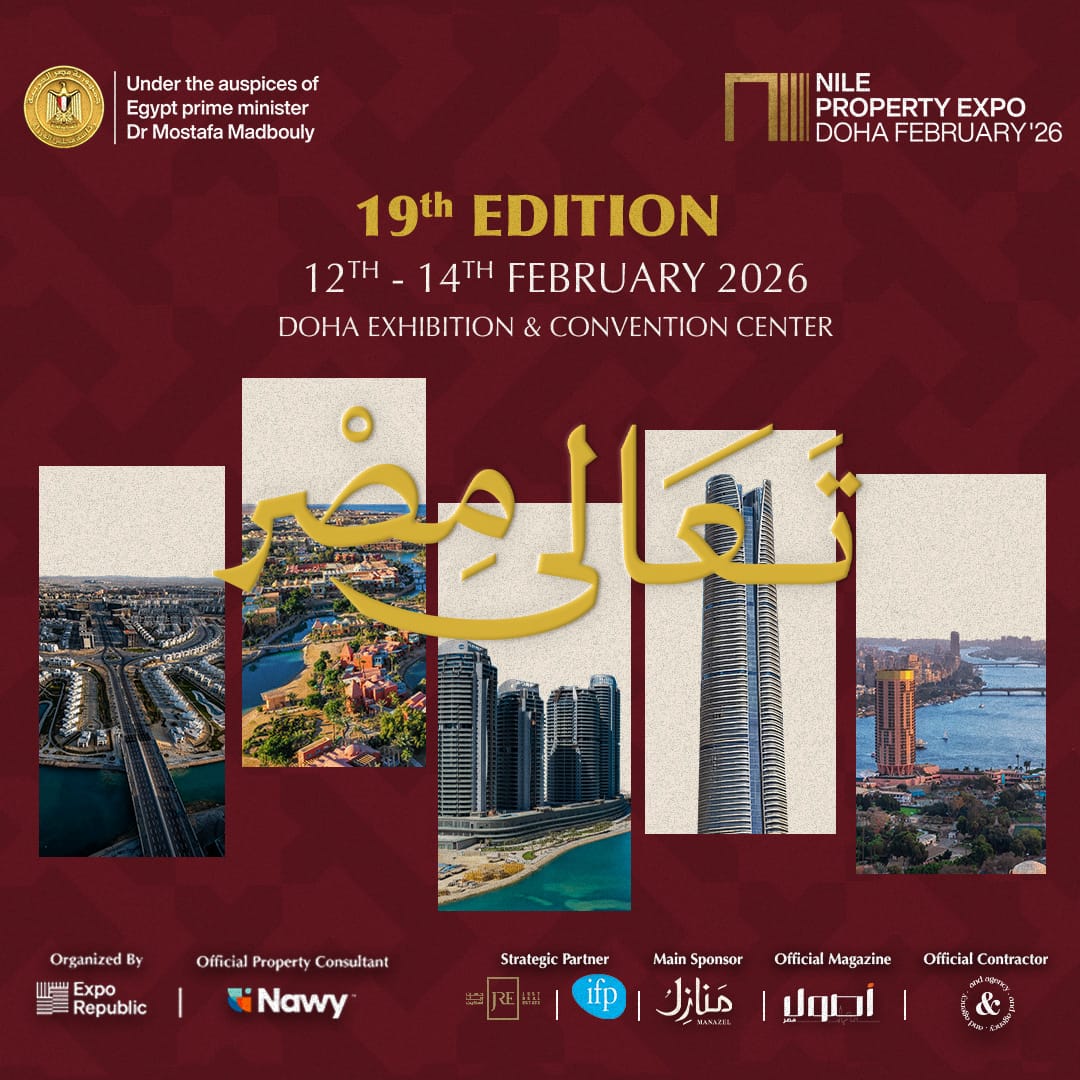 تنطلق النسخة الـ 19 من معرض عقارات النيل- Nile Property Expo فى الفترة من 12 الى 14 فبراير 2026 فى مركز الدوحة للمعارض والمؤتمرات بمشاركة أكبر 20 شركة تطوير عقاري فى مصر والشرق الأوسط ، تقدم مجموعة متنوعة من المشروعات السكنية والاستثمارية التي تلبي تطلعات السوق القطرية والطلب المتنامي على العقارات المصرية.