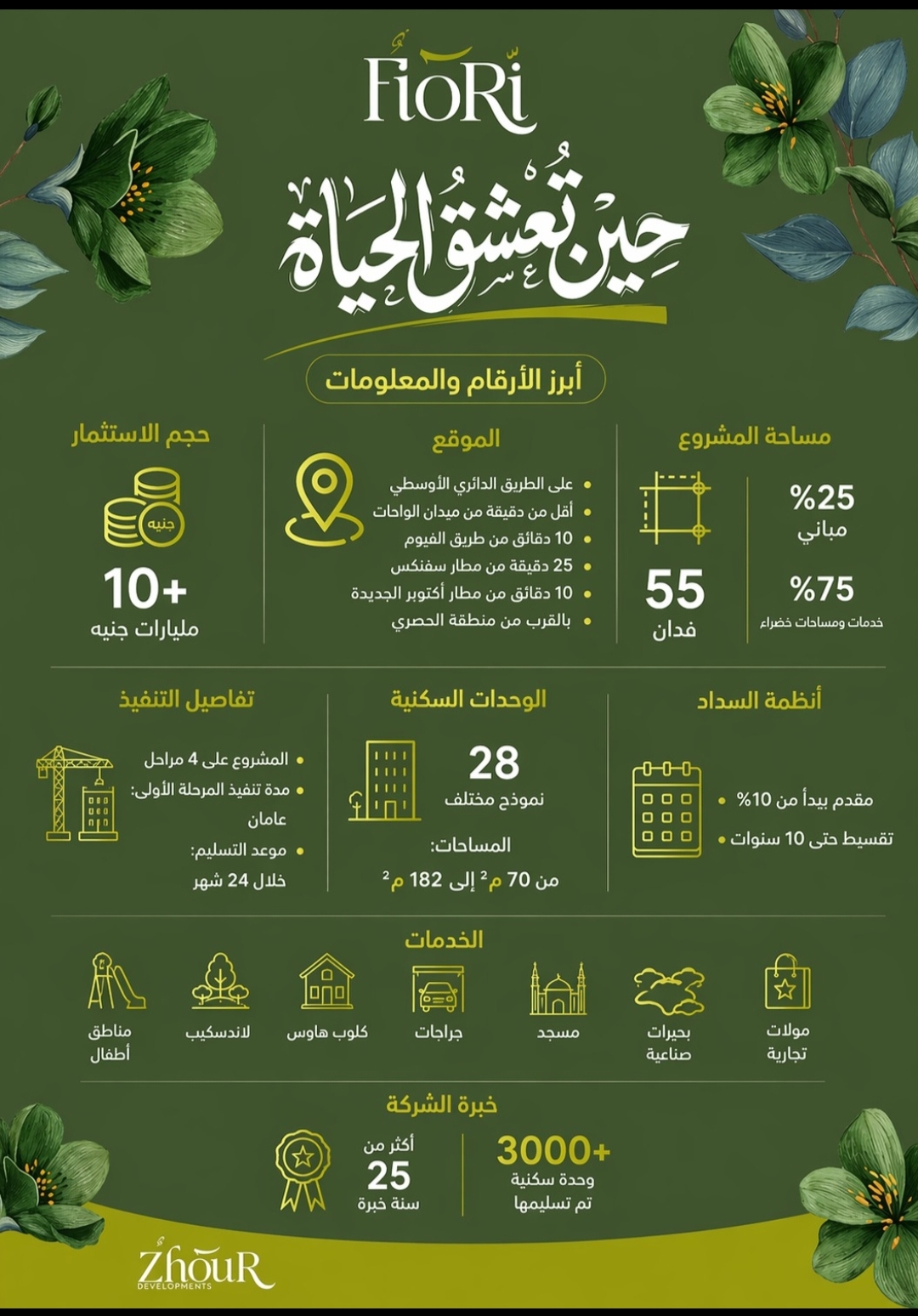 تستند شركة زهور للتطوير العقاري إلى خبرة ممتدة في السوق لما يقارب 25 عامًا، حيث نجحت في تسليم أكثر من 3000 وحدة سكنية في القاهرة والجيزة وعدد من المحافظات، ما يعكس قدرتها على التنفيذ والالتزام.